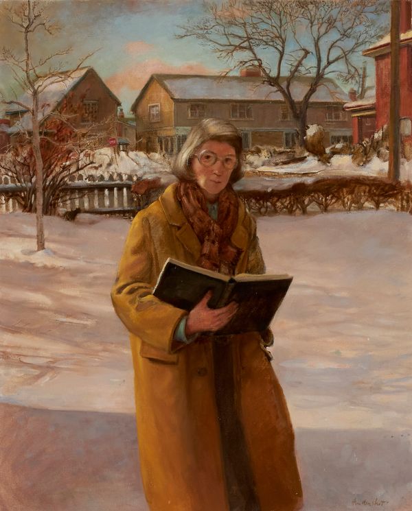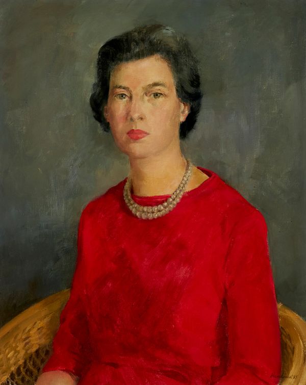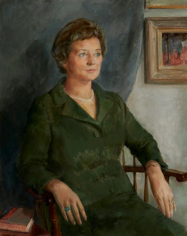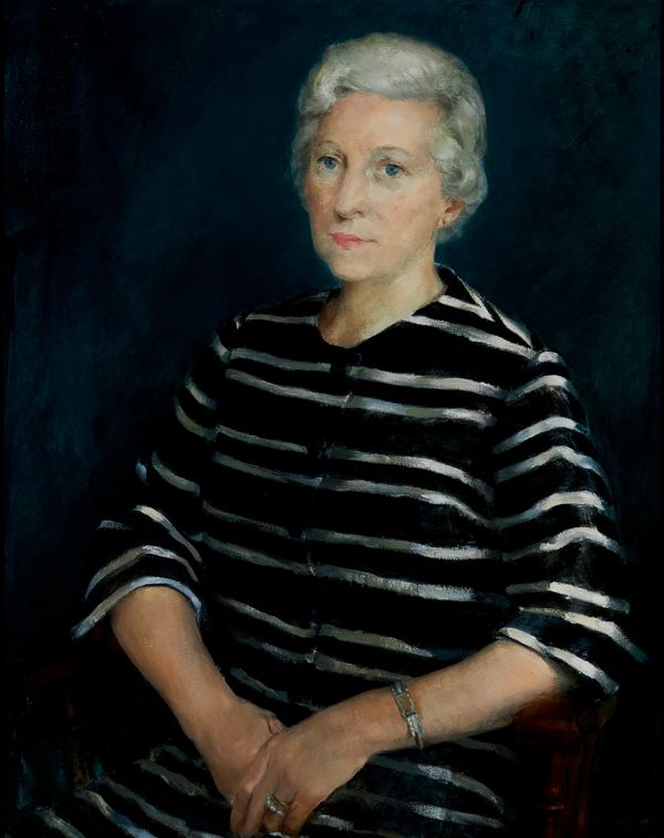So too, was her public commission Dr. Freda Farrell Waldon c. 1968., the only public commission of her career. Dr. Waldon was the chief librarian of the Hamilton Public Library and first president of the Canadian Library Association. During her tenure, the HPL became the fourth largest collection with the third largest circulation in the country. One of the features of the portrait is the striking naturalness with which Waldon inhabits the robes of honour. She is resplendent, wise, canny—a modern-day Athena. Here was a subject whose identity the artist could both aspire to and engage with on modern terms. Waldon is portrayed as a woman of thought and reflection, but also one who is subtly active. She tips her head, interrupting the direct passage of our gaze from her lap, to her shoulders, to her head. She is a woman with her own purpose, freely defying expectations, a woman not to be too easily gauged.