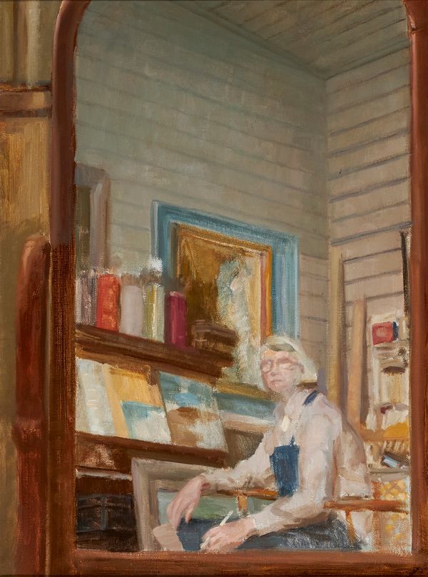 When Hendershot returned to the studio, she painted a work representing absence and dislocation. In Self-Portrait, The Artist in her Studio 1979, the artist emerges in the cluttered lower third of the work. The empty studio walls tower above her. The image in the painting is of a mirror and its reflection. The mirror--the frame of which is depicted on the left side of the picture--was used and represented by MacDonald many times in his art. In life, MacDonald held up a mirror to his wife reflecting her identity as an artist. In the painting, the mirror and the studio walls evoke MacDonald; but they are also not him. The work is a self-portrait, and Hendershot has painted the mirror herself.