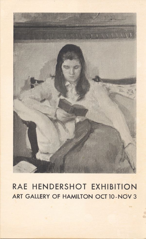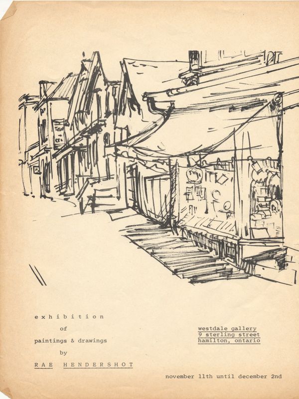 Hendershot continued to exhibit locally and regionally at venues like the AGH’s Annual Winter Exhibition and the Annual Exhibition of the Ontario society of Artists in Toronto. Hendershot pursued two commissions to decorate churches with murals but was unsuccessful. In 1961, at age forty, she had her first solo exhibition, Paintings and Drawings by Rae Hendershot, at the Westdale Gallery, a local establishment run by Julius Lebow.