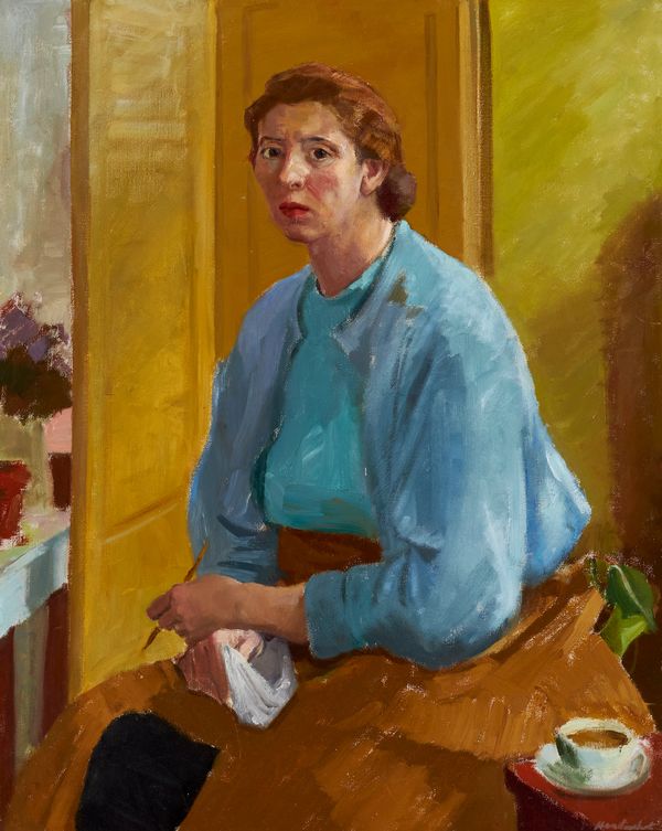 The late works are an extraordinary artistic flowering. By dimension small, they are a series of virtuosic compositions—still lifes, genres scenes, portraits. More than a restoration of her youthful confidence, the paintings—in spirit and craft--are expansive, nimble, and worldly in their artfulness, the achievement of an artist painting firstly for herself. Still Life with Painting 1984 shows the artist’s extraordinary command of colour and handling. She approaches the medium like an instrument, her performance responsive, inventive, buoyant. The work holds a tension between lightness and sagacity: by apparently effortless means, she evokes the soft wisps of a napkin’s fringe, the brittle edge of a leaf, the glassy surface of a mug, yet this textual brilliance is underpinned by the presence of steadfast attention.