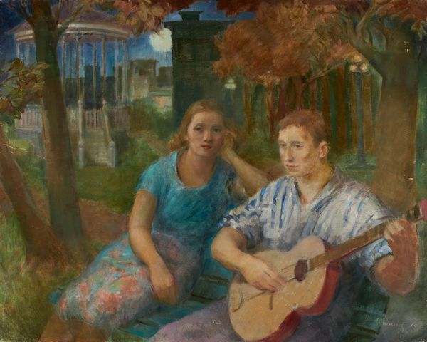 The work of this middle period reveals the frustrations and setbacks the artist faced in sustaining an artistic identity. It was a second beginning, a longer, more awkward apprenticeship. From the early 50s to late 60s her art is stylistically volatile, ranging from earth palettes with modeling, to broad flat shapes in strident colour, to glazing, to painterly techniques. Many works centre on the theme of creative identity and picture women and men in the same composition. Motifs of the artist and model, or musician and muse are recurring. In these canvases, women and men cohabit with tension. In Couple in Park, Music 1960, the underlying essence of the couple’s union is their separateness. In Other Times c. 1964-- closely related to The Singer c. 1971-72—the creative figure, the woman, is shown in a pressing state of isolation and vulnerability, while the men form a group.
