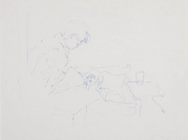 Her final artwork is a sketch in blue ball point pen on a drugstore pad of paper. Patient and Visitor in Hospital January 1988 was done while the artist was in hospital following cancer treatment. It depicts the primacy of the female bond, even in the face of helplessness; it asserts an artistic identity to the very end.